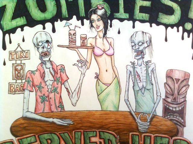 hey tiki chaps! :D just thought i'd start a thread to post some new work.. its been ages since i have done any drawing or painting so I thought it was time to get back into it.. anyway, here's my first, just a sketch on an A2 pad, finelined, and then finished with permanent marker, colouring pencils and some watercolour paint.. :) excuse the poor quality photo, took it on my phone as my camera is still walkabouts. the colours are clearer on the actual piece. 'zombies served here'
