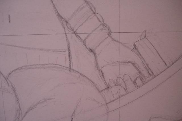 I took reference pics of my wife standing in for the character, these are in the foreground. The small sketch the large one is based on is on the easel. The most critical part of this piece is the full-size design sketch. This piece is ALL ABOUT DESIGN.