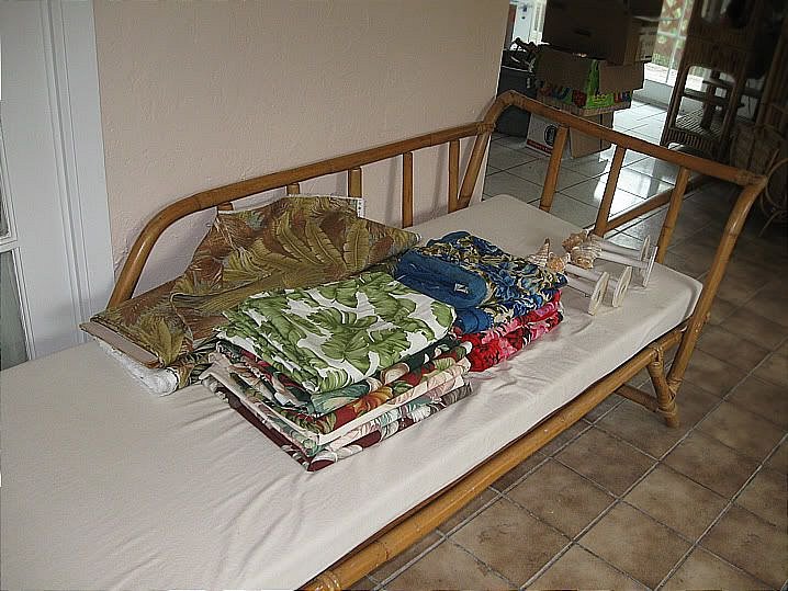 Crummy picture bt this is a daybed. A Craigslist find at $40. All the fabric laying in piles on the daybed will eventually be made into slip covers for all the sunroom rattan.