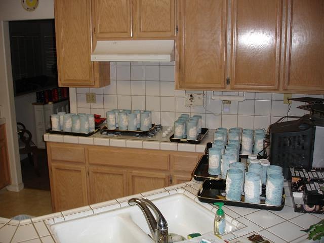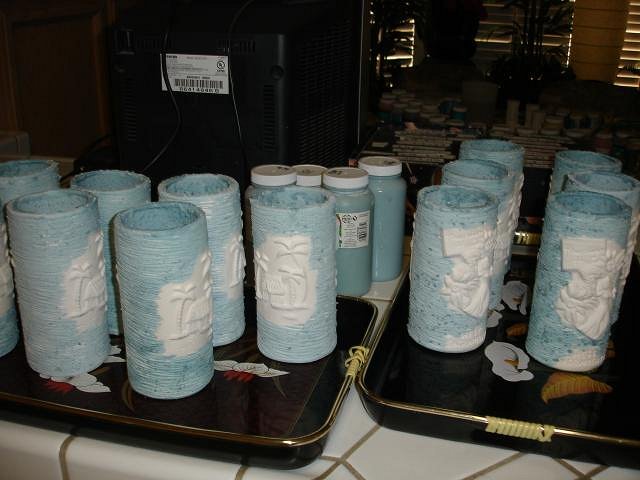 Hi Friends, I'm making a Moai bowl for Beachbumz. He and I have traded art. I have beautiful bowls for Dan's Christmas and Beachbumz will have this one in the future. This weekend we are trying to glaze all of the Sacramento Crawl mugs. This is the first time I've had them all together in one place. First we glazed the insides and turned them over to drain. Next up will be spray painting outside. Our house has been taken over by tikis! Oh wait that's nothing new. |
