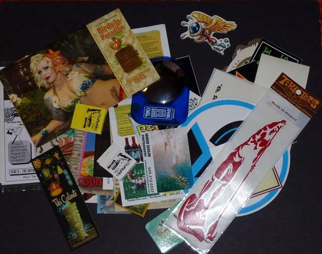 Wow.....Mongoloid outdid himself this time. A TF Lono, a LA Angels Hula Dancer and a KU beer cozy. Plus drumsticks used by Tikyaki orch's Eddie Cleland and a record breaking amount of ephemera. Even though I'm not a drummer (I try to stick to ukulele, charango, and cuatro) I can appreciate the drumsticks which were used professionally. Mahalo.... OOPS: and a CD