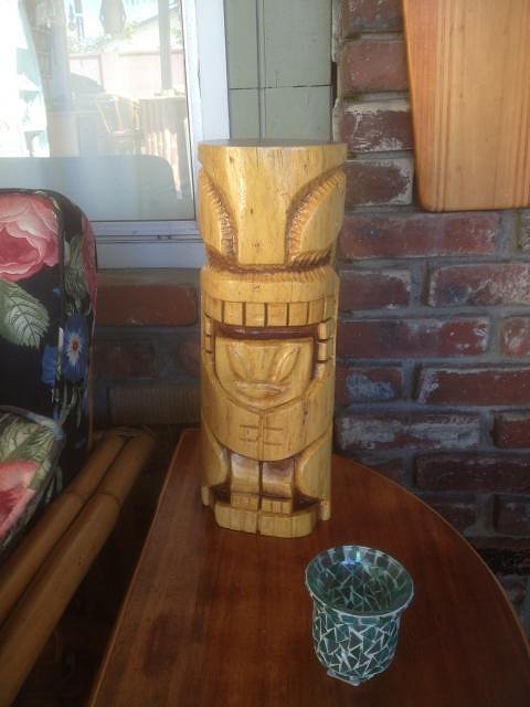 Jon (Hang10tiki)& I made our swap at Oasis. After Oasis I had a motorcycle trip planned with some friends so I didn't get a chance to put out Jon's great tiki. Here it is in my patio. It has an end table all it's self. Thanks again Jon, it looks great.