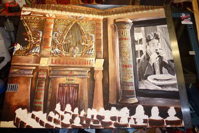I saw that it needed more light reflection from off the screen, so added more brightness to that side and made the other darker. I also deepened the theater stage, and added reflection on the stage from the movie. I studied it for a while, then added a bit of yellow tinged light to the dark side shining off the pillar by the wall sconce. It still didn't seem right. Then I realized I didn't have light bounce or proper shadow on the inside of the arch. I fixed that and called it a night.