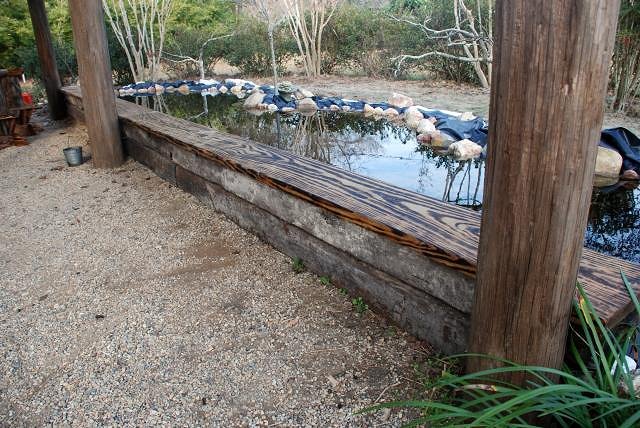Slow progress with the holidays, but I did get one side of the pond a little closer to being done. I put another layer of railroad ties on top of the first and with steel plates screwed it all together and to the poles so it's very solid. Two treated 2x12x12 finished the top, it makes almost a 24' long bench with the pond right on the other side. I am trying to decide what to put from the bench top down to cover the railroad ties, got a couple of ideas. A little later I need to finish off the rock side of the pond, I have the rocks but it's been really wet around here.