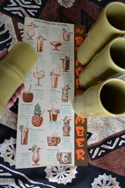 Now on Ebay, 4 beautiful Bamboo Tiki Mugs, new and unused from the Beachcomber Polynesian Restaurants in Canada. Yellow glaze with a hint of green. Follow the link to bid.