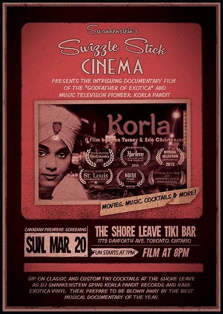 This Sunday (March 20th) at the Shore Leave in Toronto. The film's producers have given us the opprotunity to present "Korla" in a special Toronto premiere at The Shore Leave Tiki Bar in Toronto. Join us for a pre-screening Cocktail Party and sip on classic and custom TIKI cocktails while DJ Swankenstein spins Korla Pandit records and rare Exotica vinyl. We are extremely pleased to announce that a we'll also have a special exotica dance performance by the most lovely and talented "Miss Blue Suede Sue" before we screen the film. Make sure you have your tickets and arrive early. Then, sit back and enjoy an exclusive screening of what is being referred to as "the best musical documentary of the year."