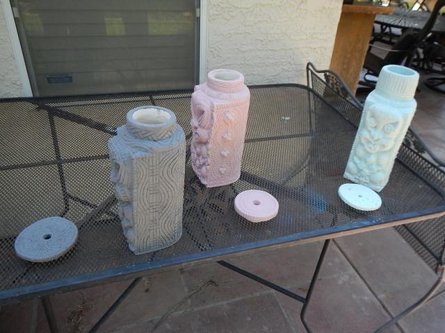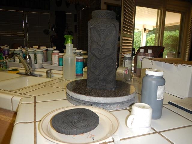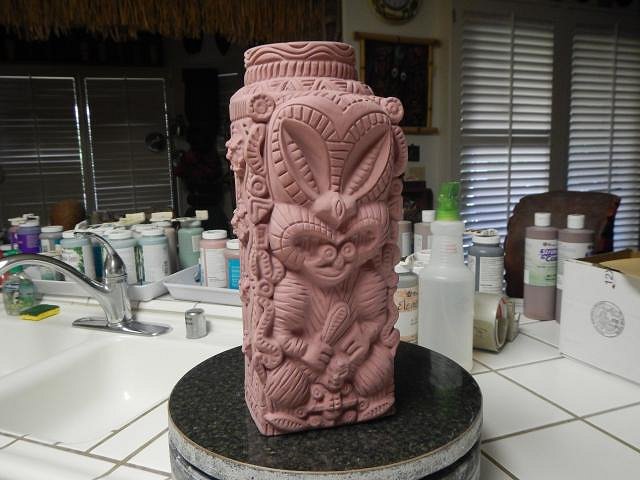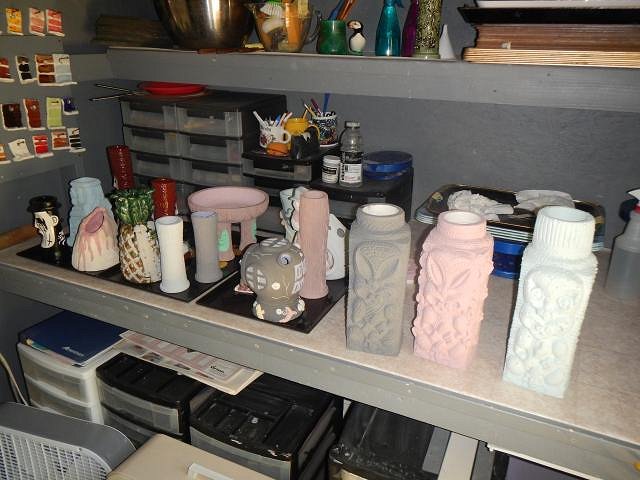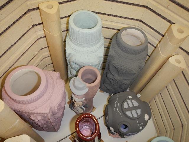 hang10tiki I am so far behind with photos that many I show here are already at their new homes. Yours will be the same. But it's fine to post them when they arrive and then I still post the steps later on. HopeChest as I said to hang10tiki, he'll have his mug way before I post the in-progress photos and the same for you. Your mug is cooling in the kiln and by Saturday morning I will be able to remove it and to check it out. The letting on yours was a killer to do and my fingers are crossed it turns out. ============================= Wish List #7 continues with some of the HUGE Maori lamps. These are not wired so the buyer has a project to finish them off. Here they are: I do projects according on how much room is in the kiln and how tall the piece is. So in addition to the two wished for lamps I did one extra. Each lamp has a removable lid. This makes putting in all the lamp works easier.