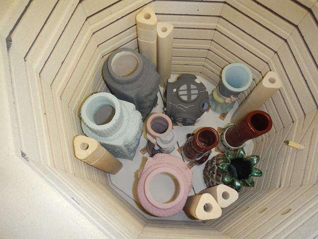 When all three were finished I put them outside to dry. If your glaze is on too thick and cracks it will separate making big glaze skips. So it's better to keep your glaze watered down and to do more layers. These had three each drying in between each layer. Once dry I could put the lids on to carry then into the kiln shed. But if I fired them this way they would be glued on permanently Now I have all the projects that needed touch ups as well as those newly glazed ready to load into the kiln. Loaded and ready to fire. But there's still more to load. When I went to put two more shelves into the kiln one was going to be too close to the thermal couple. So I took every thing out of the kiln and worked until I could to the second layer with the shelf further away. This group of photos end on 6/24/17. I have many more to post coming up soon, cheers, Wendy |