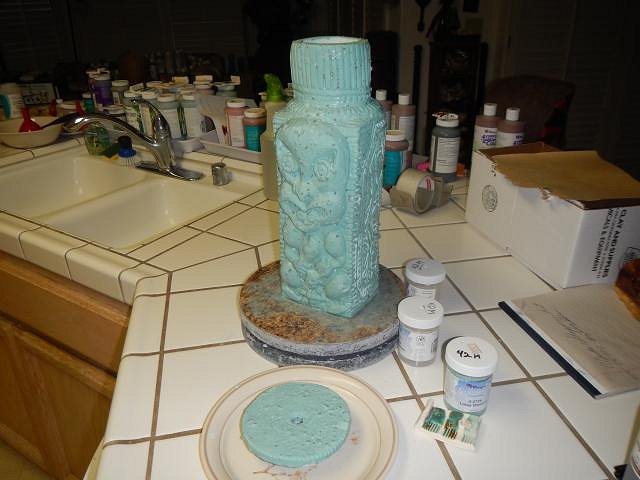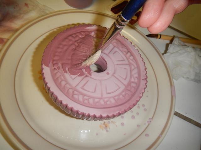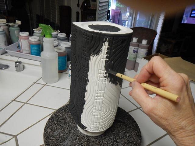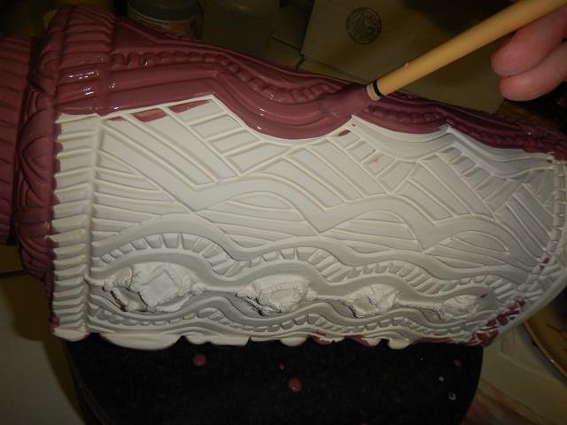 Then it was time to do the extra special lamp for Jeffery Bannow. His is one that I hand built and added on designs to the side and then carved them. He request the color of burgundy. I found a glaze called dark wine.