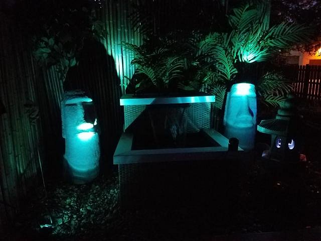 I got my small patio area up and running tonight. Bamboo fencing, a couple Moai, waterfall and a Chinese lantern. This is about the best I can do for a townhouse in the Chicago suburbs.