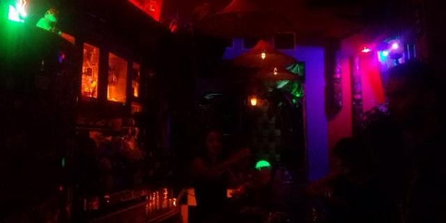 Lots of tikis, polynesian thematic pictures hanging on the wall, palmtrees, bamboo, shark's jawbone etc. which can't be seen on photos due to darkness. |