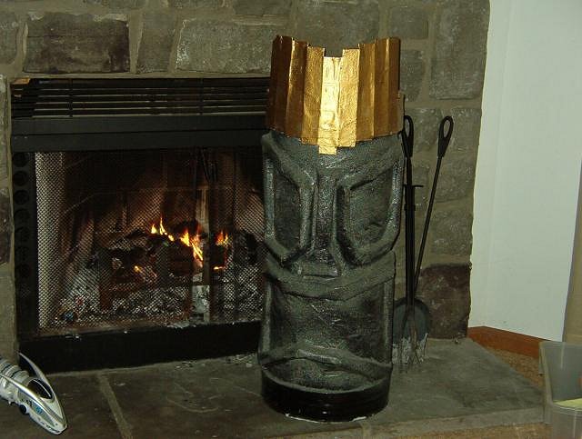 I clumsily knocked over this cheapo tiki that I picked up at Big Lots last year and after I patched and primered it I painted it gloss black then gutted a lamp for the top and viola tiki lamp.