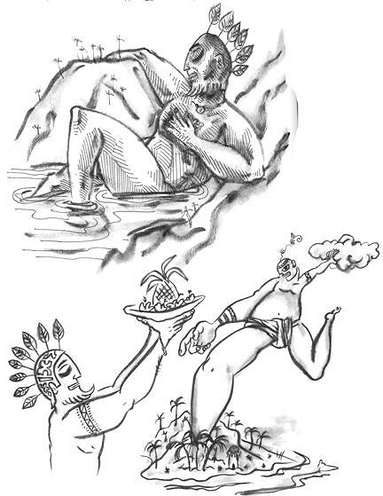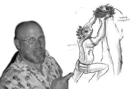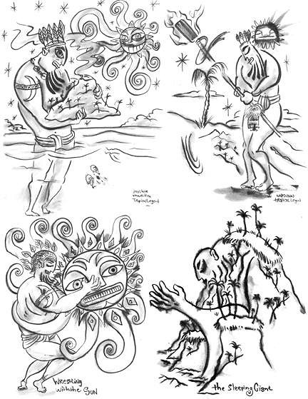 Well...enough of all these mild pleasantries! Time for some more ART! These are those sketchbook entries from my "Unknown Tropical Legend" series...these may turn into paintings someday, so tell me your favorites or suggest some other universal/generic tropical narrative idears! I'd love to hear 'em! Aloha!