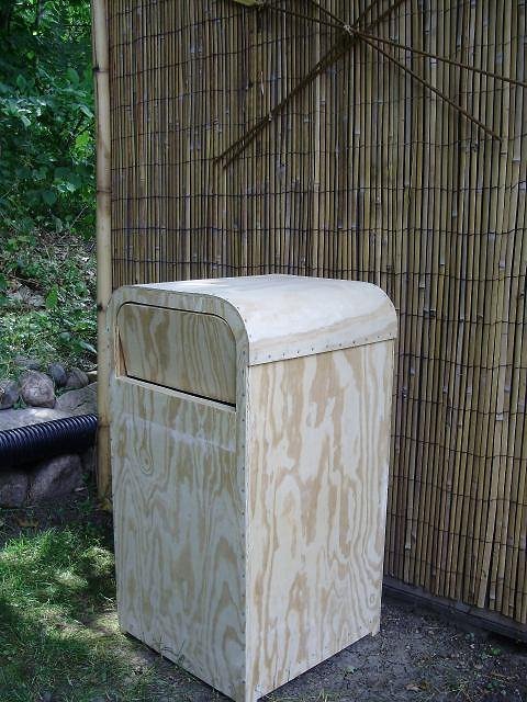 My Adventureland trash receptacle in progress. Built using wood, when completed it will resemble the two photos below. The actual metal receptacles used at Disneyland sell for $500. Mine costs only $50! Any ideas for what I might use to simulate the rivets?