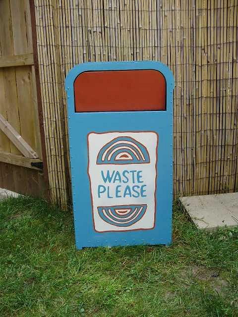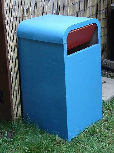 You can use 1/4 inch carriage bolts (smooth round-headed bolts) to simulate the rivets, available at any hardware store. Nice looking DL replica trashcan :) |