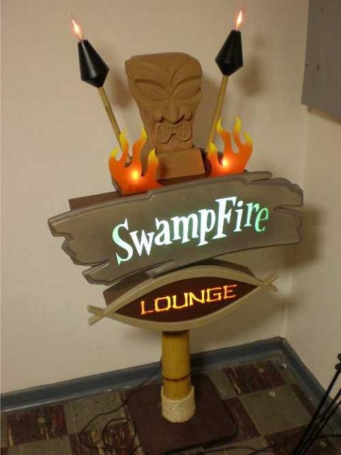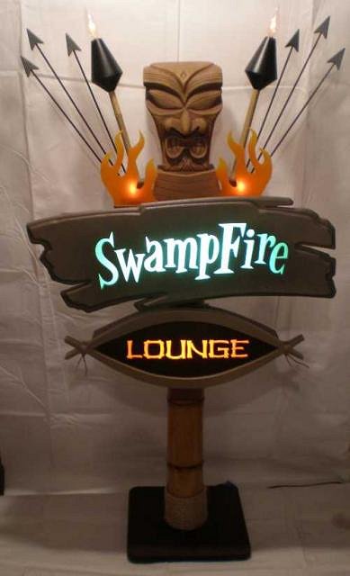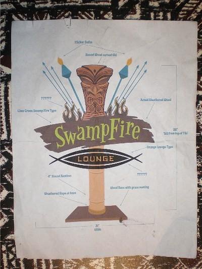 greetings and happy new year!!! thought i'd start out the new year by sharing a project i have been working on and off of over the past few months.....Back in may doug horne of swampfire lounge approached me about making him one of my sign replicas based on his logo for his artwork and website.....the plan was to have it done in time for last years 2008 tiki oasis to be unveiled in his booth.....unfortunately, a few set backs occured and rather than rush it through and half-ass it, i informed doug that regrettably, it would not be ready in time.....since then i have been chipping away at it when i can and this past holiday season i was able to rally and start the big push to completion..... it's about 75% there.......i decided with doug's blessing to post progress pics here ......this will help me stay focused toward it's completion. here's a few random early stage shots, followed by the latest pic i took this a.m. of the sign with light boxes fired up and ready..... Here's the only piece of info i had to work from....i based the sign on doug's dimensions and had to wing the rest....