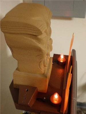 this picture shows the platform which is attached to the bottom of the head with screws...the acrylic flames slide into location and can be removed for shipping or for travel...behind them will be one flicker flame bulb each.....after i mount the blocks to hold the torches and the spears i'll cut away any excess material from the platform so that it's not so square and large...
