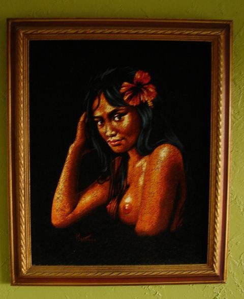 I went with leleliz to an estate sale last Thursday. This velvet nude was advertised and when the sale started liz bee-lined it in and staked a claim. Although not a Polynesian nude, a nice one anyway...