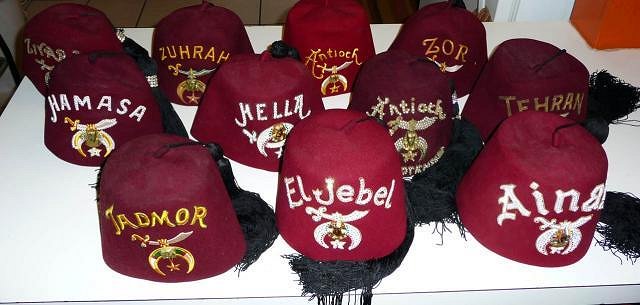 Don't own a fez (yet). But our boat club has an annual event that we hold in a rented room at the Hella Shrine Temple. Here's a picture of a case with a donated fez from every Shriner Temple in N. America, displayed in order of the Temple's founding: |