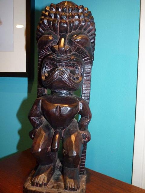 Thank you so much Sabu, that was a lot more info than I expected, and I REALLY appreciate it. He is 15.5" tall. The man at Havaiki in Hanalei said he came from an estate somewhere on Kauai. The deceased mans daughter stopped by Havaiki and said "I hate all this tiki stuff, take it." That's pretty much all the info we got, other than it's from the mid-century. The wood looks pretty old and has some cracks on the back. We don't want Tiki Pete(his new name) to be alone, so we have some books on the way so we can start our research and venture into the wonderful world of tiki collecting. So excited!! Thanks again for your help. julie |