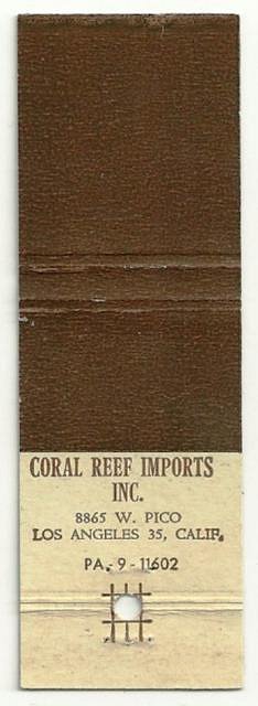 A matchbook from the Coral Reef Imports in LA, surprised this was not listed in the telephone ads posted by Bora Boris.