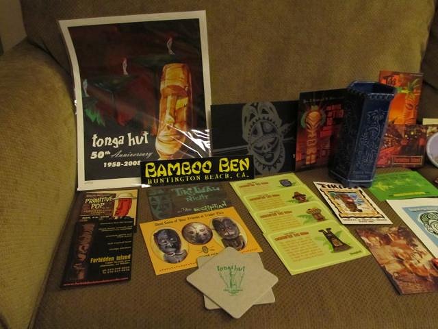 And close-ups of the many postcards, fliers, matchbooks, magnets, buttons, coasters, a tonga hut bottle opener and a tiki ti flashlight, not to mention a Tonga Hut 50th Anniversary #20/50 print again, made by the man himself!:
