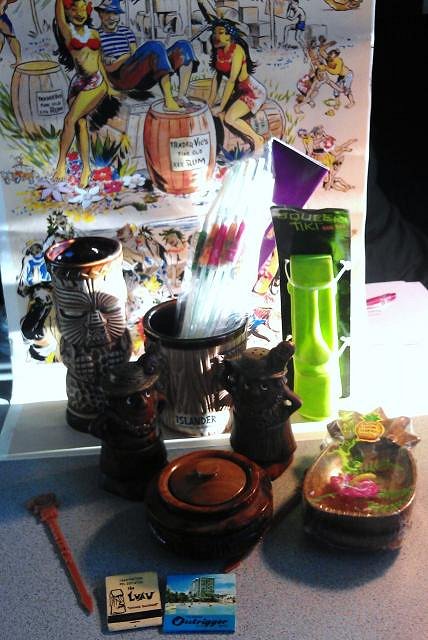 A mug from Daytona's Hawaiian Inn, a huge volcano bowl, an ashtray from the Lanai in San Matteo, matches from The Outrigger, The Luau, Kelbos Fairfax, and (non-tiki, but cool none the less) Pie King in Arcadia.