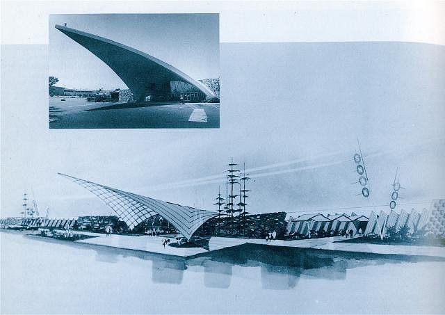 "Willow Grove Lanes was the most ambitious project undertaken by Powers, Daly, and DeRosa... The 800-foot-long V-shaped building took fifteen months to build. Viewed from the outside, it was nothing if not breathtaking. The main entrance was highlighted by a solid parabola that swung skyward 116 feet and hovered over a multicolored water fountain situated in a miniature lake. When you entered the building, your eye was drawn to a rotating turntable display of bowling paraphernalia. To accommodate the disparate needs of different types of customers, the architects provided a variety of ancillary social spaces. Their nursery boasted a life-sized rocking horse. Teenagers fraternized at a soda bar called 'The Hutch.' Adults were invited to sample the German fare at the 'Hofbrau,' a full service restaurant" (excerpt from the book Diners, Bowling Alleys and Trailer Parks by Andrew Hurley, 2001, pp. 154-155).