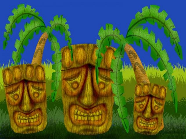Gave the tiki some wood grain and made a couple of copies and resized them. Now I got a tiki family. Might as well add some palm trees. Notice that one of the tikis looks like it is behind the palms and the others in front. That is the magic of layers again. Each one and the trees are in different layers. You can shuffle the layers around any way you want to create your scene.