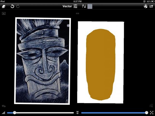 I know up until now I have used the method of starting in grayscale, but this tiki is what the cool kid artist call a speed sketch, so I started more simply. I used the vector method to create the basic head shape already the color I wanted. Then quite quickly I sketched in the features, eyes, nose, mouth, and some other stuff. It was sloppy but I find that you often come up with some fun images by just letting your hand go where it wants. You get some extra strange lines that way, but as they say in the music biz, we can fix that in the mix.