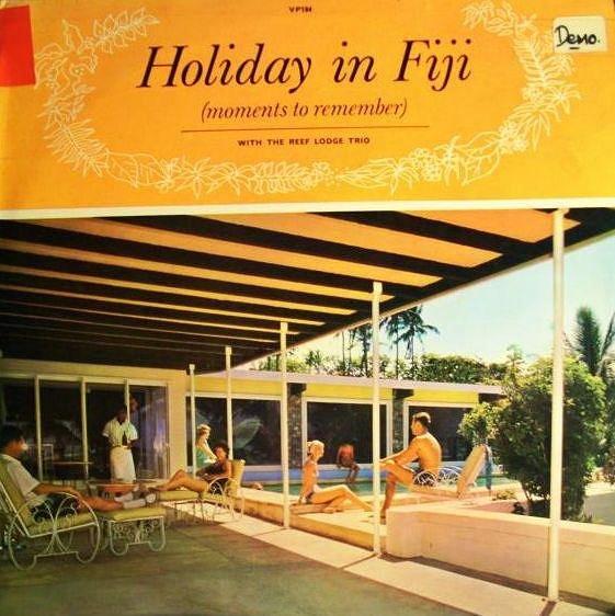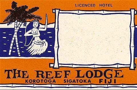 "For your listening & relaxing pleasure, The Reef Lodge Trio offers such varied selections as Steel guitar rag, Hawaiian wedding song, I sailed away to Fiji Islands, Isa buna, Wildwood twist & Deep in the heart of Texas..all in a lilting Polynesian style. Holiday in Fiji: Moments to remember was recorded live at the Reef Lodge in Korotogo, Fiji with a written warning on the back cover that it is NOT for distribution in Fiji. I guess they wouldn't want the workers to get TOO relaxed. Mai tai anyone? (Viking VP184, New Zealand)" Source: Kaiwaza And this baggage label has popped up in various places: