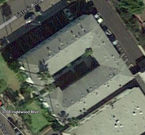 Yes. It's a panel made out of painted (it's painted now anyway) bamboo stretched between the buildings. You walk underneath it to enter the courtyard. The doors to the units all open onto the courtyard. I could not enter, but there did not appear to be anything of interest inside anyway -- at least not anymore. The complex is actually just one U-shaped building, as you can see from above. |