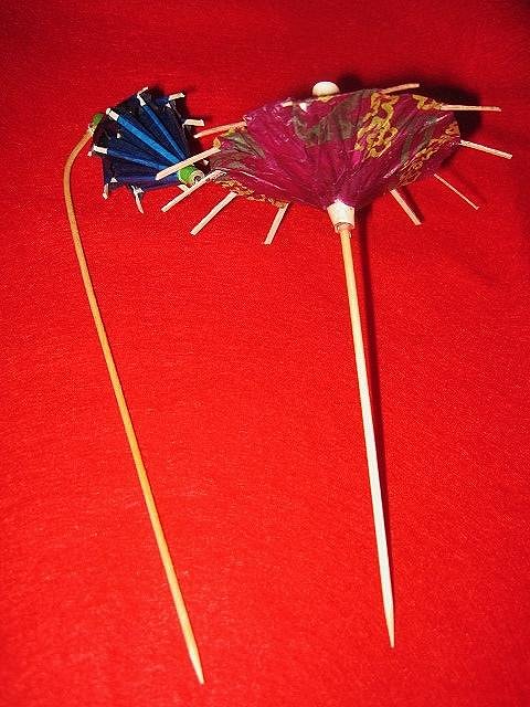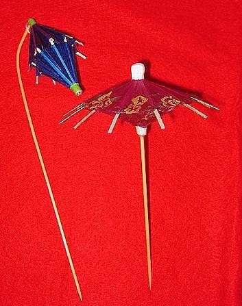 Sorry to say, I don't have good photos of these. I used to, from some or other import website which had them...until I went to buy some and they weren't there any more. Both versions have the main part built exactly like a paper parasol pick, except that two of the umbrellas are attached at their wide ends, forming a 'paper lantern.' One version, and I actually have 5 of these (one of each color) from an estate sale, have the lantern mounted at the end of a long wooden pick; they came 'closed' (narrow) like a parasol pick, and when the lower end was pushed up the stick, it opens/widens the lantern. The others are pictured (though small) in this post: Does anybody know who sells these, or have a pack of them I could buy? I don't imagine I'd use a lot of them, but once in a while they'd be great! |