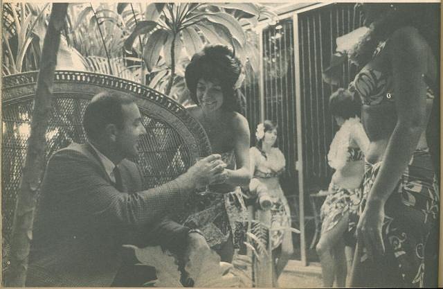 This image is of interest for what you see in the background. This photo was taken in the Garden seating section. If you sit in front of the stage today, that is still known as "Garden". At this time it was an open air area. There were lots of palms and live plants in there they swapped out weekly. But behind Bob Thornton you see glass. Those large sliding glass doors were on both sides of the dining room. You are looking at Samoa, but they also enclosed Hawaii, Oahu, Tahiti, and all the rooms. This way, those areas were air conditioned and the main room was open air and had large lauhala matting punkha fans overhead making a constant breeze. A stream ran through the whole restaurant starting at the large waterfall out front, through Molokai and Garden and back out to the feeder pond out front. More details in my book coming out in August!