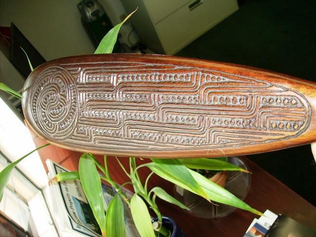 I think thats a Maori Patu (or a mere, meremere, kotiate) probably made in New Zealand from matai wood, the carving is quite detailed so I suspect it was made in the 1960's. The club is missing its strap which would go through the bottom hole.