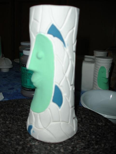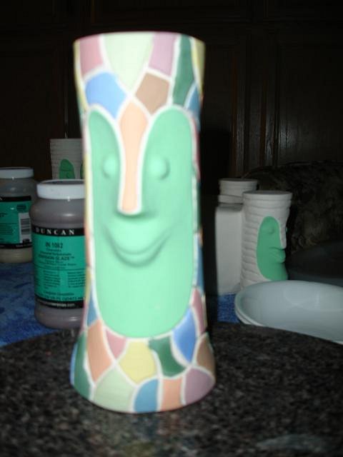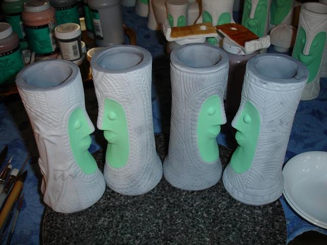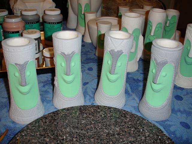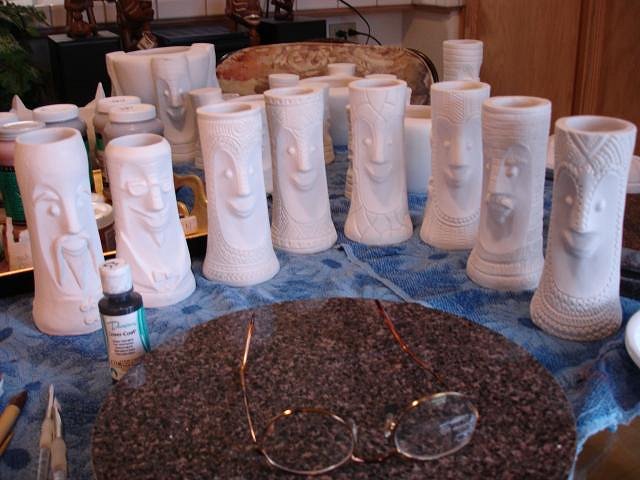 Tom - Ten, nine, eight...I really do hope to have them fired and out of the kiln within 10 days if I can keep up this pace. Thank you for that comparison, terrific. Progress Report: First off I apologies for the blurry photos. With the small screen it's hard to tell if the photo was OK in this case not. I caught up the last Blue Bob and then added the third coast to all four. I had a request from blacksandz to do a PNG Bob and to age him. This is the first time I've tried to do something like this. Beachbumz gave me some tips. First off a coat of Duncan cy122 my very favorite glaze for Bobs. I started on the zerostreet mug. Next up Loki Tikis dog Tiki Ba. At this point I had worked from 8am until 5pm. I was done for the day. Dan and I had dinner and put on the TV to relax. Well why not start on Atomic Chicks mosaic Bob. I started at 5:30 PM. three layers each color. I'm behind in my Spanish lessons so I'll do one before I start to paint this morning. I'm not yet half way through the Bob's but that's my goal for today. It is supposed to stop raining by Wednesday. I'll glaze some Torches if that's true and have my tests ready for the kiln with the Bob's. The timing for all these projects has been perfect. Thank you all for keeping me busy during the rainy season. Thank you for all your notes. Cheers, Wendy [ Edited by: danlovestikis 2012-03-18 09:26 ] |