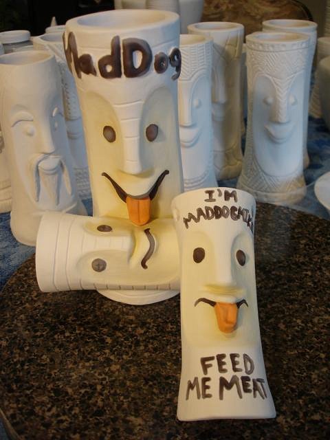 WestADad I could tell you read every word I wrote and fulfilled my request, thank you. Did you get caught? I hope not. Professor G I tried but the kiln burnt it off. Maybe there will be a fingerprint left somewhere. Progress Report: MadDogMike's necklace and Cannibal mug. Three coats of each color. The yellow faces barely show. Second layer of white on the faces. Next up was three layers of black on the faces and facial hair etc. This morning I opened the kiln. Loki Tikis dog and the zerostreet mugs are now ready for sanding and painting. Yesterday I felt like I was making snow men all day long. Today I'll catch up these two mugs. I won't be doing my tests on the Zombie Torches until the rain stops next week. Very soon I get to start adding color to these men. Cheers, Wendy [ Edited by: danlovestikis 2012-03-15 09:34 ] |