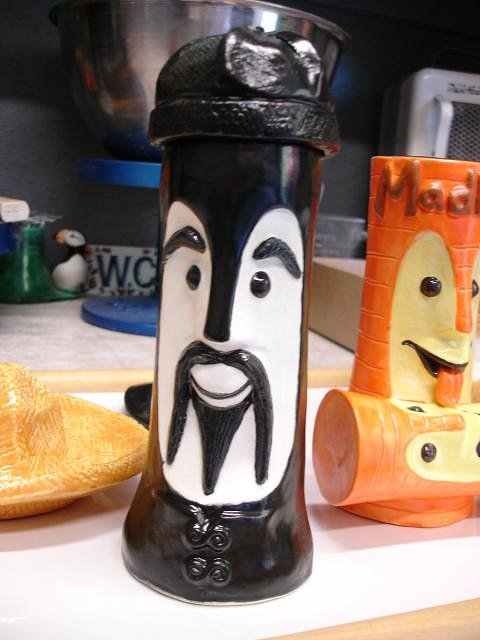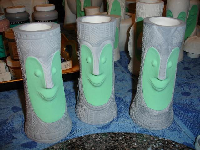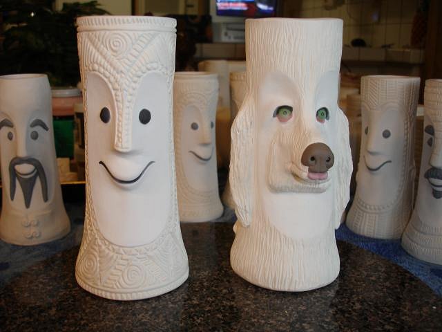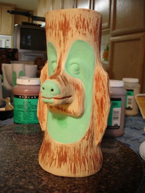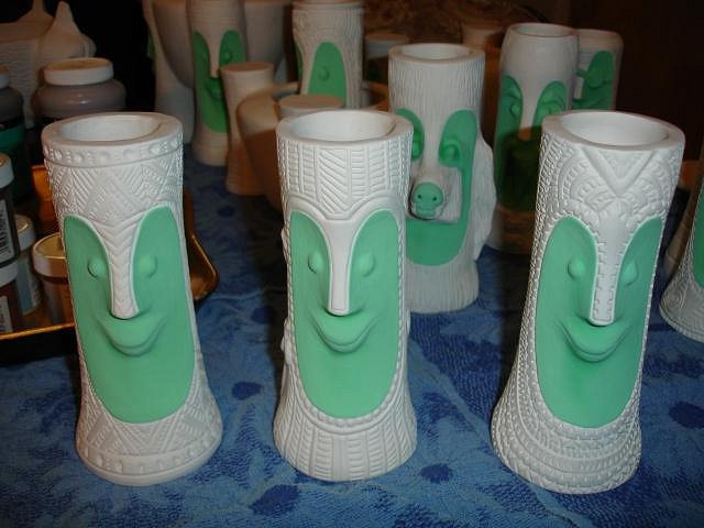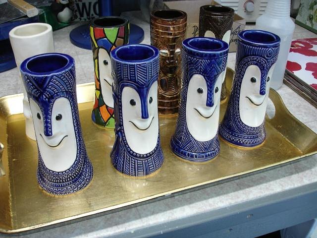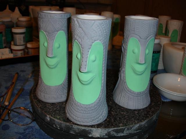 Psycho Tiki D it does amaze us that our first ceramic mug was made here only 19 months ago. We are happy that we didn't just buy all the stuff and then let it sit. You started it all by asking me to make the Zombie Hut/ Coral Reef mug, thank you forever. It's hard work but we are so happy making new friends and having our "children" go to good homes. Atomic Chick glazing is not predictable and there are glitches. See below ): MadDogMike I learn more every time I lift the lid. hang10tiki people say that all they can think of to write here is the same thing each time. I have the same problem, I want to say thank you over and over. But without these simple words I'd never feel the love and I'd stop posting. So wow means a lot to me. Thank you! Kele I'm so happy to see you here and to know you are nearby. Atomic Tiki Punk and hang10tiki the photos are coming up after I show you what else I did yesterday. I hope you can scroll slowly. ebTiki wrote me a very nice PM. Eric I'd love to see you post here too. Progress Report: OK people yesterday I worked on projects and yes also opened the kiln. Here are the photos of my day. I wonder if you will look at them all or skip ahead. First off I examined each Zombie Torch mug and looked for five that were not as perfect as the others. I made 35 so I could do five tests and then these become ours. I will let you all help me decided what the run of 30 should look like. I then glazed the Bumatay Bowl. Next up hang10tikis bowl with red lava. I made it thick but my best guess is that it will melt into the brown glaze and be flat like the photos you sent. Tall Bob Bowl with the glaze test for the color choice. The four Bob Bowls drying. Into the bottom of the kiln which was still at 100 degrees from the firing. Now I glazed my small Super craved Tiki Bob statue. Top Shelf of the kiln. Bottom shelf of the kiln. There are so many glitches with glazing that I will detail here how your mug turned out and what I will do to fix any problems. South of the Boarder Bob for The Blue Kahuna. It turned out beautifully. Now I need to just enamel paint all the hat designs. If you have a photo of a sombrero you like send it to me or post it here. MadDogMikes Cannibal mug and necklace - perfect. Loki Tiki's dog Tiki Ba has several little streaks of brown that I will glaze over with more yellow today. Tiki Tom D some of the black satin glaze was not thick enough so I'll add more today. bavtech same here. Three coats of the black satin wasn't enough so I'll glaze it today. blacksandz your mug is a challenge. I will add some more glaze in red to the body and some more pale off white in the cravings and if you don't like the improvements with glaze I can enhance it with enamel or Dan's ready to add it to his collection. Let me know what you think. I do need to add the black to the mouth because I forgot to do that. zerostreet it's perfect PM your address so I may send it to you. Atomic Chick. Not one single crack showed up. Dan loves your mug so if you want to wait for a few months I'll try again. On the front of Mosaic Bob in the green tile there are black dots. I will sand these off and re-glaze this tile. Blue Bob Group. There are small pale dots of blue on the faces that I need to glaze over. So here is my work for today. My goal is to finish the fixes and get these into the kiln tonight or in the morning. Overall I am super happy with how they came out. There's always something to fix. Well what do you think? You know I love your comments. I'm off to work, Wendy [ Edited by: danlovestikis 2012-03-21 12:52 ] |