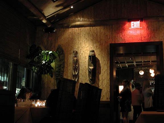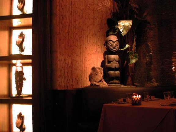 And possibly more telling: As we were having dinner, a woman approched us and mentioned that our tiki shirts seemed appropriate atttire. She introduced herself as the designer, and asked us what we thought of the restaurant when we said we were into tiki. We said we we liked it, and she said that was good, considering she'd never been in a tiki establishment before, other than the original Luau (which must have been in her childhood). She seemed almost proud of her lack of tiki experience.