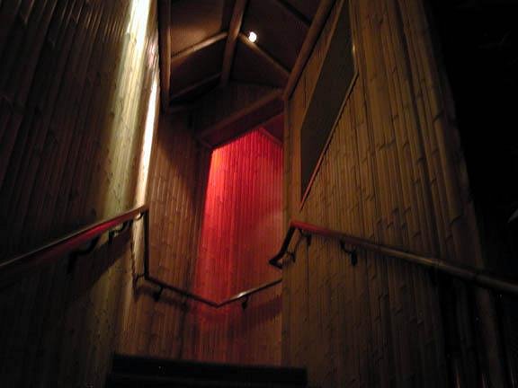 The restrooms were up a flight of bamboo lined stairs. At the top was a small insanely-bamboo covered room: walls, doors, and ceiling. It was very cool!