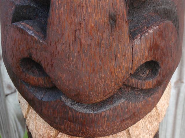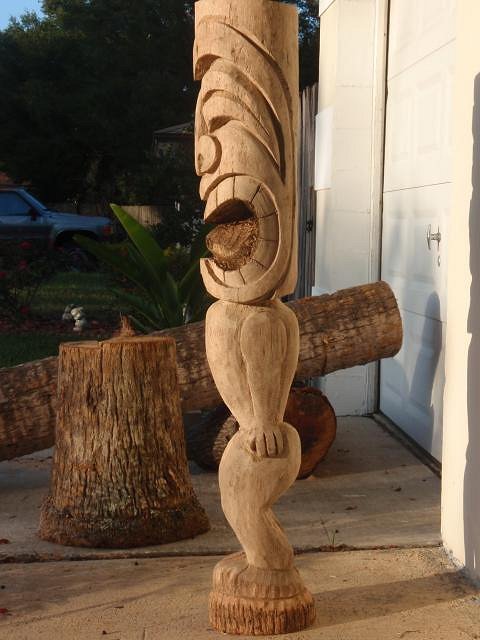 When I suggest "carving deeper" perhaps I wasn't as specific as I should have been. This is intended as constructive criticism - I hope you take it that way. When most people start carving tikis, they scripe lines into a log that convey the image of a goofy smiling face (FL carvers especially - since thats the image we see most in touristy spots). Its quick and easy for people that are just getting into carving (you're past that point). I am just as guilty as anyone of embracing the "the big goofy smile", however there are other styles and representations of tikis beyond the basic. Many of them can not be created with chainsaws and angle grinders. The shape of the log should not dictate the shape of what you are carving. Conveying the shape and posture of a human(ish) body takes some thought (not just the body but the face) and practice. Look at anyone's profile it is not round and cylindical. Eyes are set in, noses stick out, mouths can dictate expression, the chest can dictate body posture, and position of the legs are the base. My suggestion to "carve deeper" was meant to get you to explore the shapes and relationships of a more "realistic" figure. Also, do a search for authentic oceanic figures and idols. Try emulating some of the more simple figures, like a Tangaroa, a Moai, or even a Marquesan. They may have simple designs, but their relationships to proportion and symmetry can be a challenge. Take your time! Put down the chainsaw and pick up some chisels - accidents happen to fast when you use a chainsaw. Practice digging all the way through a log with the chisels - wood goes all the way through to the other side, but is softer on the inside than the outside. Palm is strong and can take a lot of stress - the only way to find out how much is to test it. I have several pieces laying around that I did experiments on. Mistakes are essential to the the learning process. Good luck - keep carving deeper! |