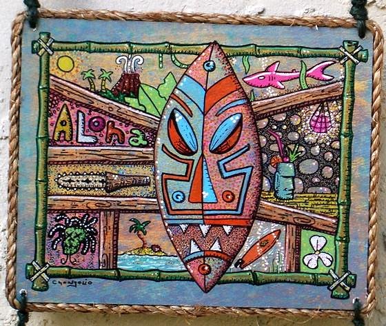 Acrylic paint, bumpy paint, paint pens and tiki bling on a foam core sign substrate and framed with rope.