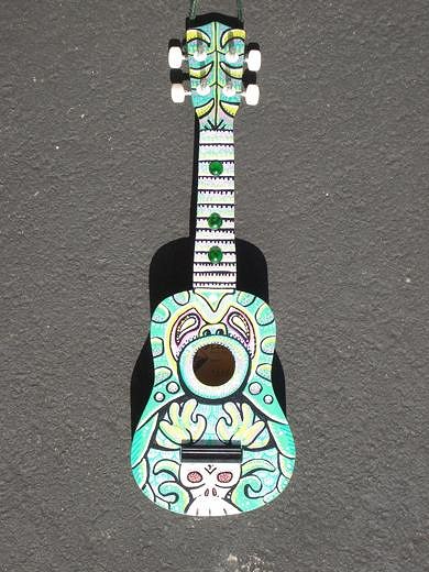 Acrylic paint, paint pens and tiki bling fret markers on an ukulele