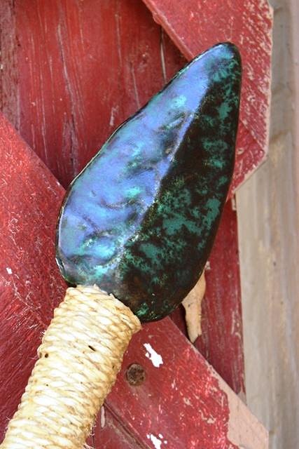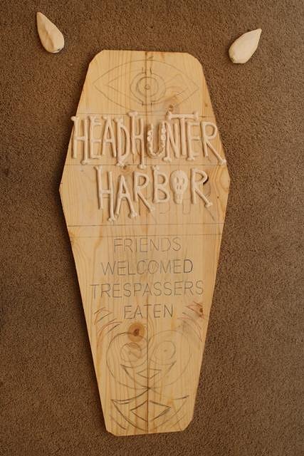Hospitality is key in any society, even cannibals. So I decided the Headhunter Harbor needed a welcome sign :D Here's some progress pics if you're interested. New "clay resist" burning technique in steps #4 & 5 Step #2 - Form bone letters and spear heads from paper clay. Step #3 - Fire and glaze the letters and spear heads. Router designs in the wood. Step #4 - "Clay resist" burning technique. Form letters out of clay onto the wooden shield, press them down to make good contact. while the clay is still well, burn the wood around the letters with a torch. Step #5 - Remove and discard the clay letters, leaving an unburned area below them. Take a wood burner and define the letters. Step #6 - Burn and brush the wood. Glue the fired and glazed bone letters to the shield. In my first Headhunter Harbor sign, I made the "U" from little individual vertebrae. This time I tried a jawbone with teeth. Step #7 - Paint accents, make and attach spears, skull, beads, etc. I tried a new glaze for the spear heads; Malachite. Malachite is my favorite semi-precious stone but the effect is a bit subtle, I don't see that I will be using this glaze much. |