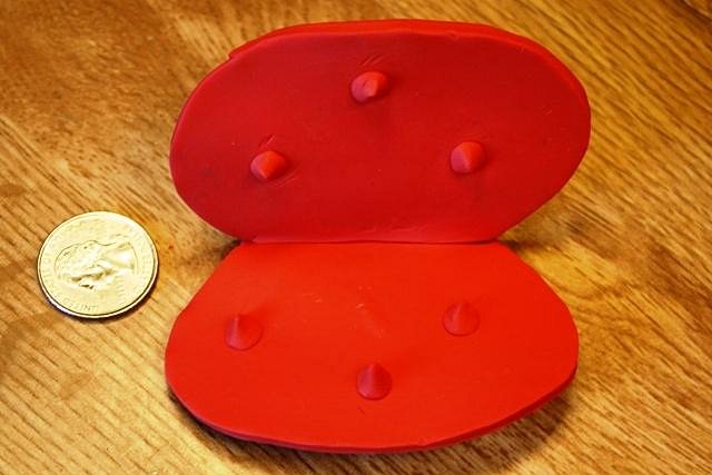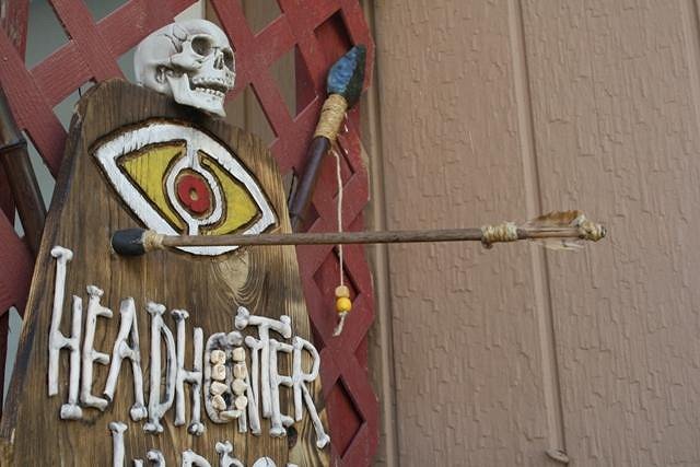 Hilda, Marlene, Wendy, Jon, David, Lance, & Greg ~ Thanks you very much, you are all friends and always welcome. I will keep the natives at bay and promise you won't be eaten! Been busy with a "commercial" Tiki project that I can't post yet but did add a little embellishment to my "welcome sign" including this arrow stuck in the wooden shield. I bought a Venus Flytrap at Home Depot the other day to plant in my tropical garden (I didn't know they are from the swamps of South Carolina!), we'll see how it does. I decided it must be the most "headhunter" of all plants so I decided to add a polymer clay version to my sign too Here's some step-by-step. I made the red inner "flower" part and baked it. Quarter to size comparison I made a wire armature for the stem and the "teeth", epoxied it on and held it with clothes pins After the first batch of epoxy dried, I removed the clamps and really gobbed on more epoxy. It was going to be covered so neatness did not matter, only strength. Filled in the gaps around the wire and rolled out and cut the green underside part of the Fly Trap. Clipped the "tooth" wires Then I pressed the green underside to the flower, covered the stem and teeth with more polymer clay and baked it in the oven. |