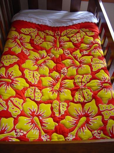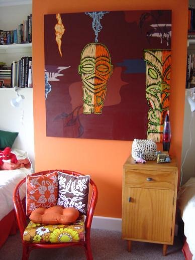After what I saw, the next one may be a tiki giving birth to another tiki! Feature wall with tiki painting by Zena Elliott, tivaevae cushion covers from Rarotonga. Just to the left is Daddy's collection of books on Oceanic and Maori Art and carving...(there's a BoT in there somewhere too) Cot with Hibiscus print blanket from Rarotonga |