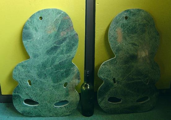 Here's something else - I was talking about these with hewey the other night and seeing Tama's new big-ass hei-tiki reminded me about them. Two 2 foot CNC-cut green marble hei tiki - these are going to be "wall pendants" with giant plaited cords. They are on the "some day" list at the moment, as I will need to set up a bit of stuff to be able to work on them. They're hard to photograph because of the mirror polish which I will sandblast off. That's a wine bottle in between them: