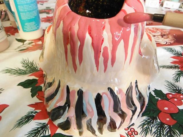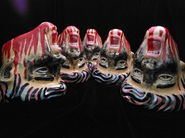 LoriLovesTiki I'm lucky he shared it with me. tigertail777 I thought it was GROG in the spoon! hang10tiki his favorite book too. GROG he thinks he looked better in your photo and wants to grow it back. That black velvet keeps him in the garage. hang10tiki yummy. I caught Dan checking out his stash of tikis above the refrigerator. He has invaded the kitchen in more than one cupboard and I don't even consider this a tiki room. Progress Report: More glaze popped off of Mr. Pac Man so I've decided to just paint him with enamel and give him as a gift to Atomic Chick. I just can't spend all these hours re-doing this mug. Maybe one day I'll start from scratch. But for now my goal is to make him look presentable. This first load of Severed Heads out of the kiln was a test load of the spray painter working. To get the glaze to come out I had to add a small amount of water. This thinned the glaze. So I re-painted the skin, the black smudges, the hair and the added far more blood. They go into the kiln today.