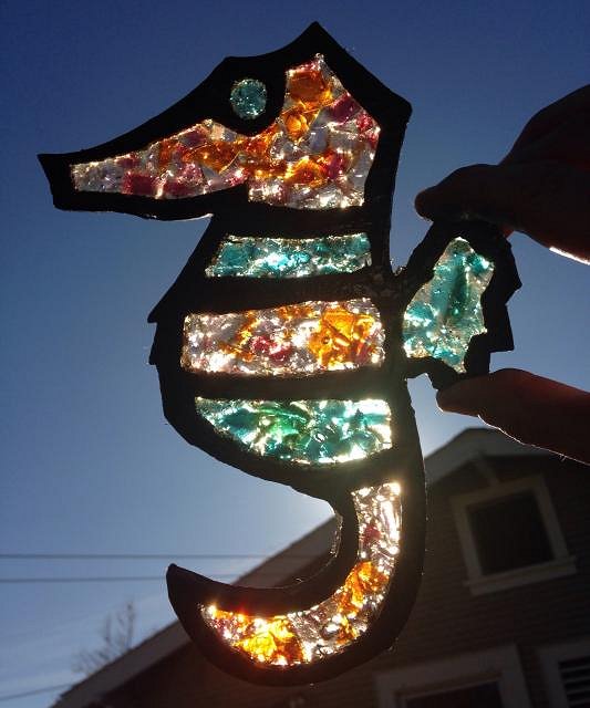 Aloha, I've wanted to try a seahorse panel lamp for some time now, so I'd been saving all of my leftover resin and smashing the pieces into tony bits to collect enough for a faux stain glass effect. I'm guessing there's over 25 hours in this project and over 4 pounds of resin. There's a lot I learned through making this one, but I'm glad to be done. This one is going to my brother and his family for Christmas.