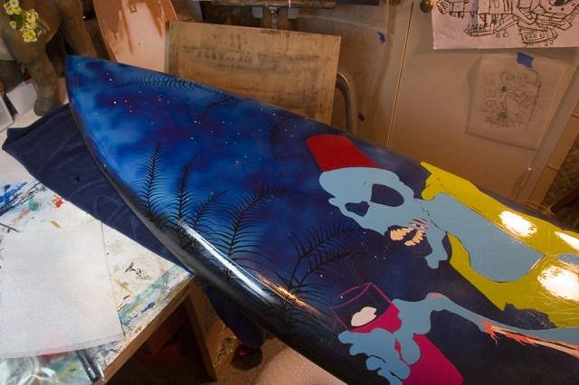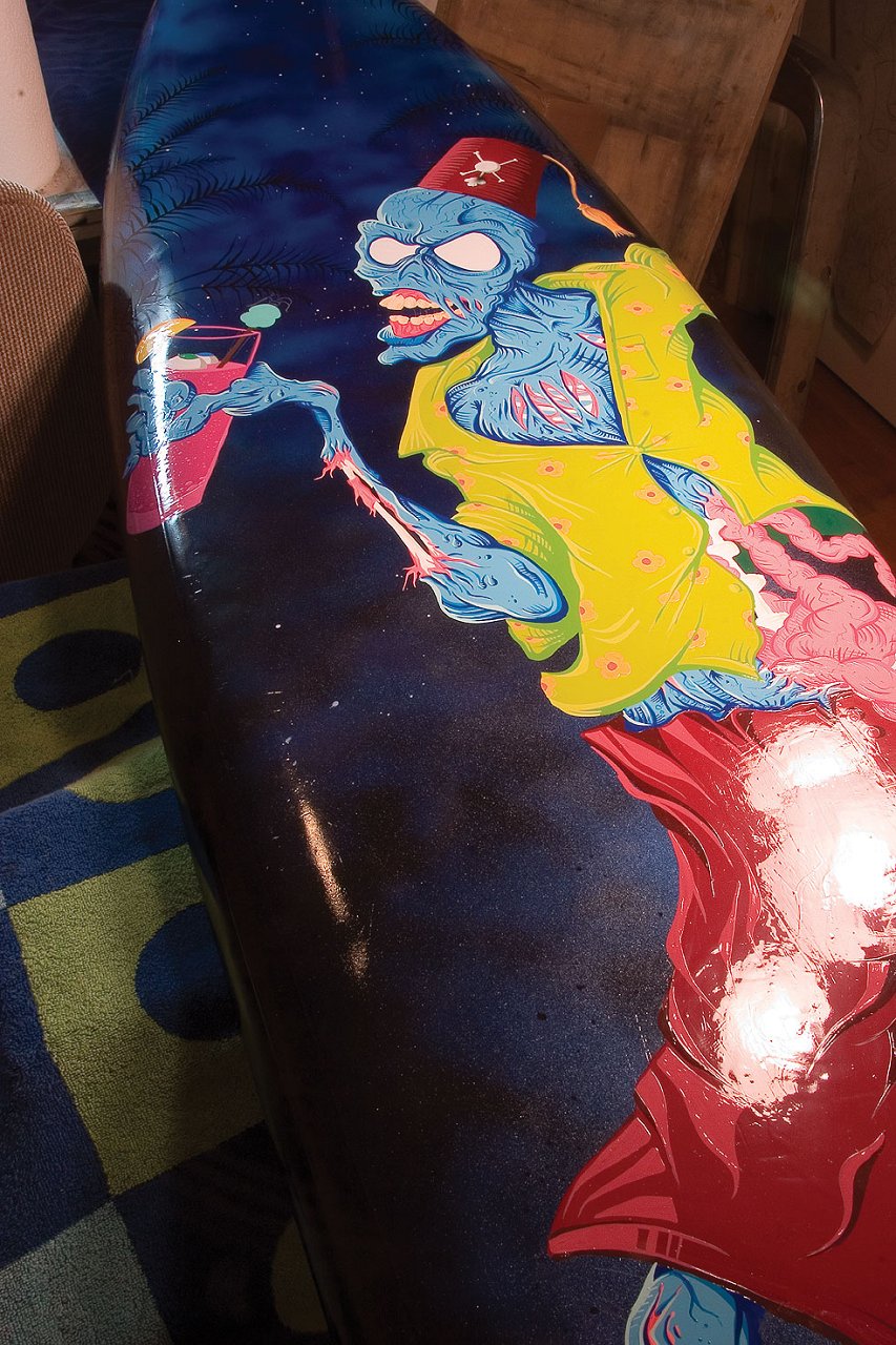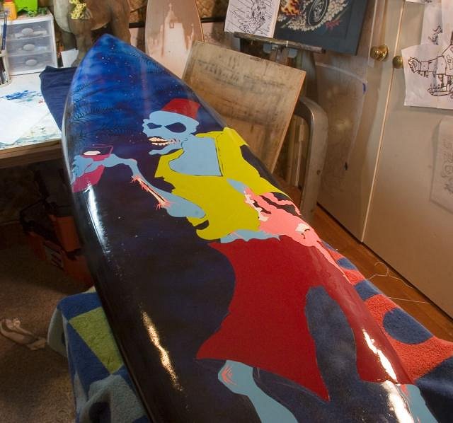 thanks guys......SurfT I don't think it's a gun....it's an old custom 70's board that had a glassed in fin. Donated by a long time surfer who I still thinks it's going to go back to his house when I'm finished! Tonights work...I know it doesn't look all that different but added some blue and green highlights, worked on the zombie drink and some tidbits here and there... the color on the green shirt is waaaay off in these pics...